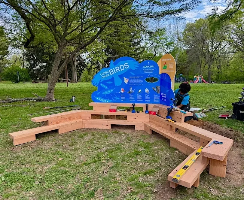 Clean Air Council is again partnering with community stakeholders, Tiny WPA, Amber Art and Design, and Parks and Recreation to create Little Nature Playgrounds at Cobbs Creek Park entrances. In 2025, Cobbs Creek Park received four Little Nature Playgrounds installations along Cobbs Creek Trail – at Cedar Ave, 61st St, Thomas Ave, and Florence Ave – and this new project will add three more locations.