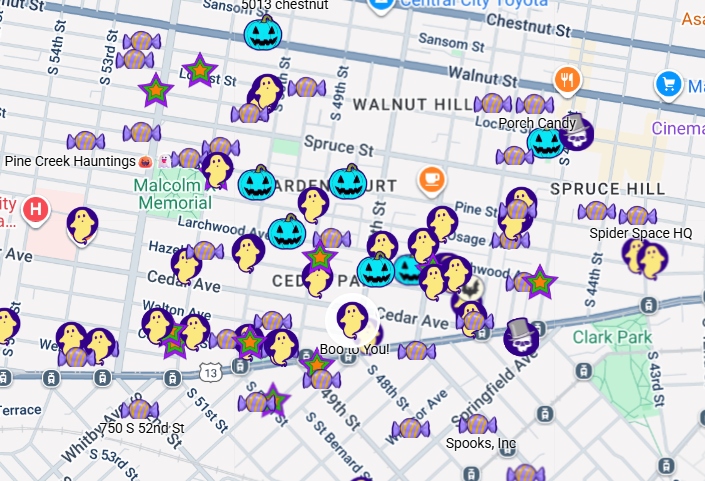 Dozens of West Philly residents and some organizations have registered their address for various spooky season happenings or activities since our first post about it in early October. You can browse the database or use the map (see the screenshot above), just enter your zip code in the search window, to find out what your neighbors are up to on Halloween – from giving out candy, to decorations, to events.