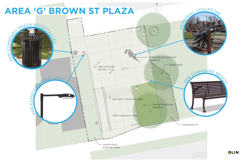 • A redesigned and refurbished Brown Street Plaza (see rendering below)