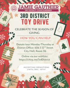 The annual 3rd District Toy Drive is underway and this is a great opportunity to make holidays brighter for local families and children in need. The Office of Councilmember Jamie Gauthier, who represents the 3rd District, is accepting donations of new, unwrapped toys through Thursday, Dec. 18. Here’s how you can participate in the drive: