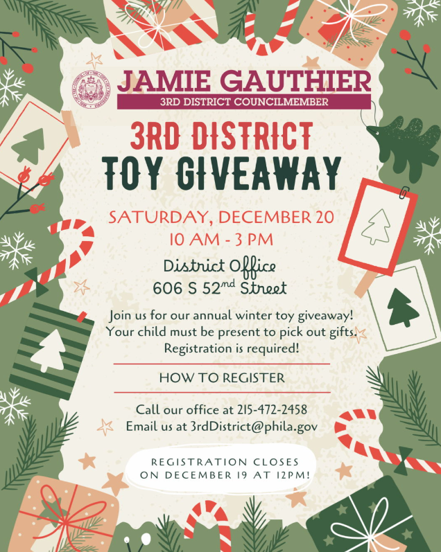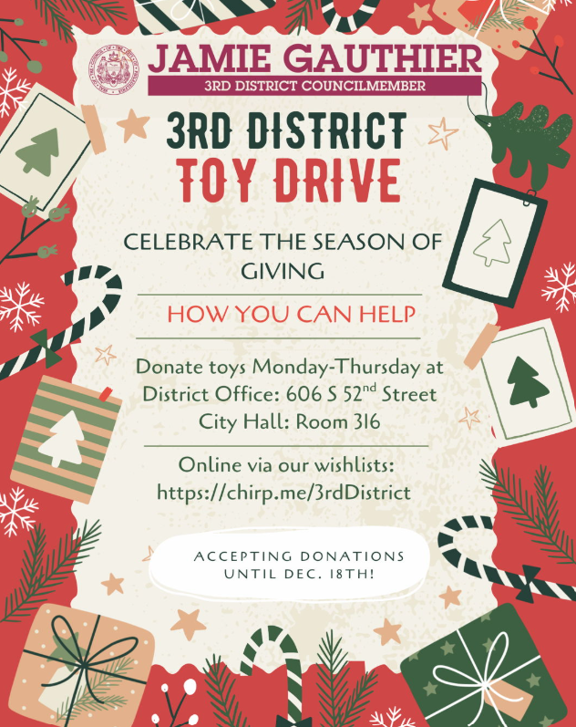 Toy giveaway will take place on Saturday, Dec. 20 from 10 a.m.-3 p.m. at the 3rd District Office (606 S. 52nd St) and families are asked to register by Dec. 19, 12 p.m.. Check out the flyer below for more details.
