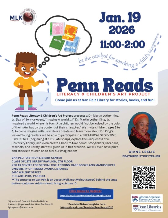 Penn Reads Literacy & Children’s Art Project presents a Dr. Martin Luther King, Jr. Day of Service event, “Imagine A World…..!” Children ages 3 to 8 are invited to come imagine with Penn Reads while they create and learn more about Dr. King’s vision. Young readers will be able to participate in a theatrical storytime experience (beginning at 11:30 a.m. sharp), explore the uniqueness of a university library, and even create a book to take home! Pizza and snacks will be provided. This event is part of the Dr. Martin Luther King, Jr. Commemorative Symposium on Social Change. Register here.