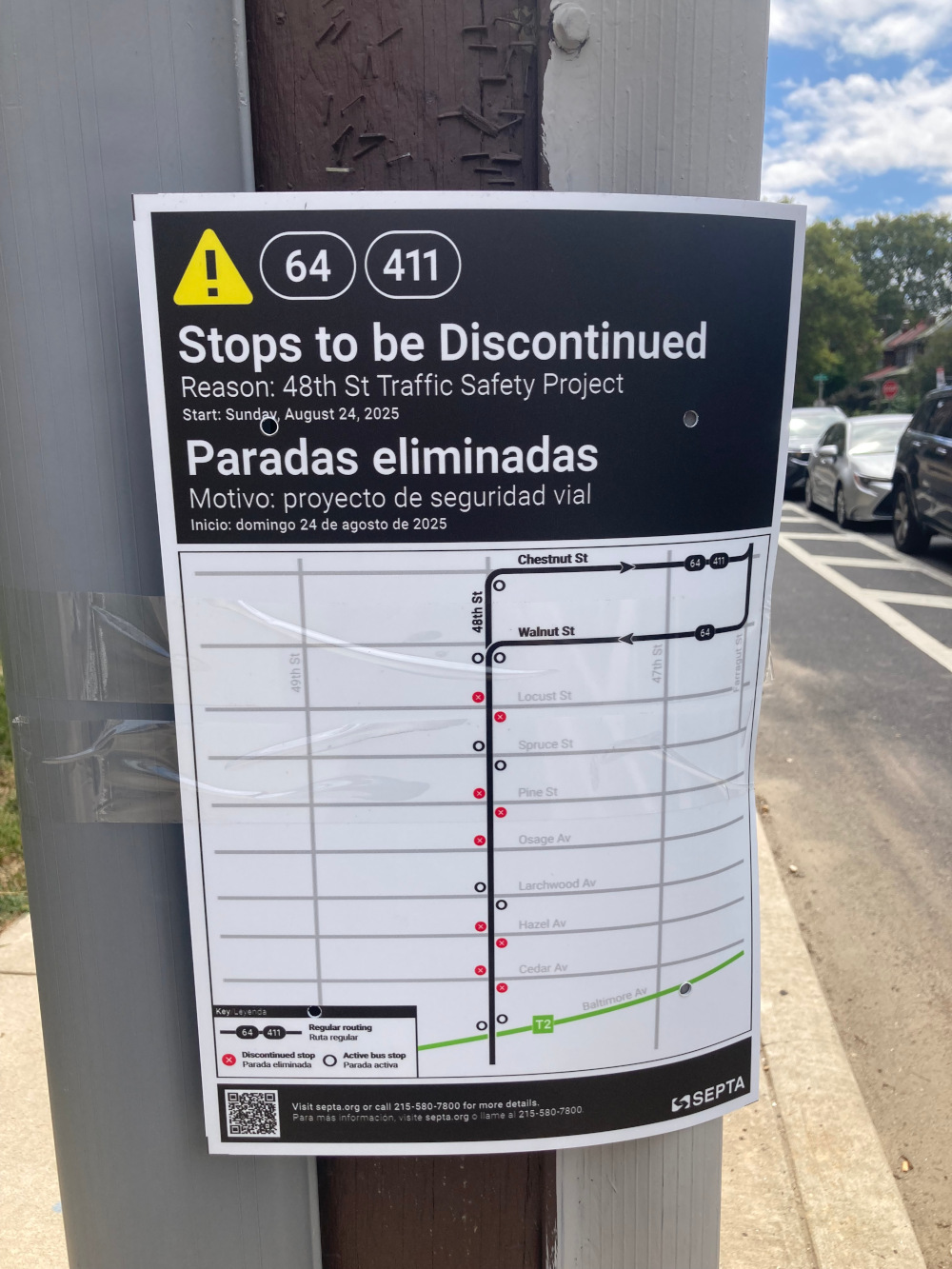 Beginning Sunday, Aug. 24, SEPTA will discontinue several bus stops on 48th Street between Walnut St. and Baltimore Ave., the portion of the street used by the Routes 64 and 411. The following stops will be discontinued: Locust St., Pine St., Osage Ave., Hazel Ave., and Cedar Ave.