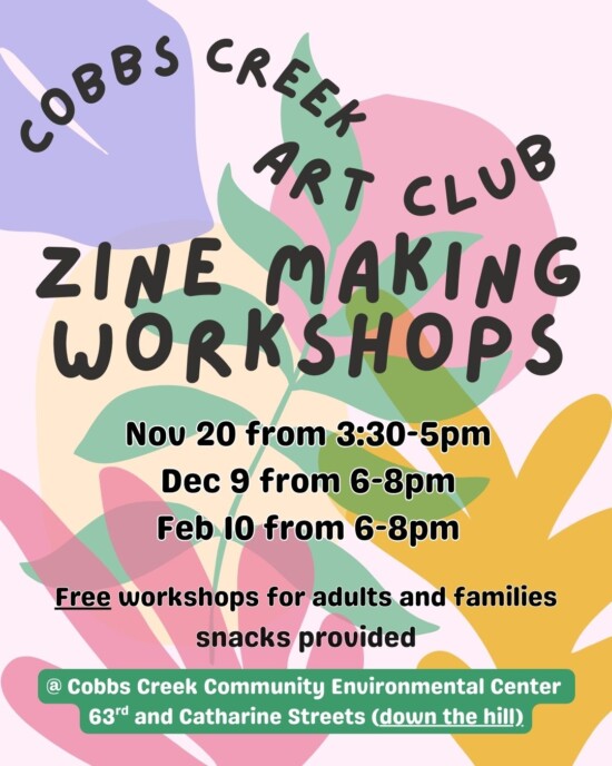 Join us for a special workshop on Tuesday, February 10th, from 6 – 8 pm at Cobbs Creek Community Environmental Center. We’ll have creative stations including storytelling & mapping, drawing our favorite plants, and creating coloring pages for a community zine about Cobbs Creek. The workshop is family-friendly, for all ages, and refreshments will be provided.