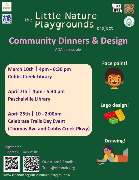 In 2025 Cobbs Creek Park received four Little Nature Playgrounds installations and this new project will add three more locations. Four community dinners and design workshops provide opportunities for community members to inform the future design and locations over the first four months of 2026. Check out Cobbs Creek Watershed Coalition’s Facebook or Instagram, @cobbscreekwatershedcoalition, to stay up to date with the project. The project team also created a short survey to learn what neighbors would like to see in the design and location of the future installations.