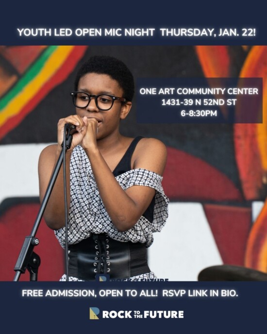 Rock to the Future is kicking off the year with a Youth-Led Open Mic Night! The event takes place on Thursday, January 22 from 6–8:30 PM at One Art Community Center in West Philadelphia for an evening of music and creativity.